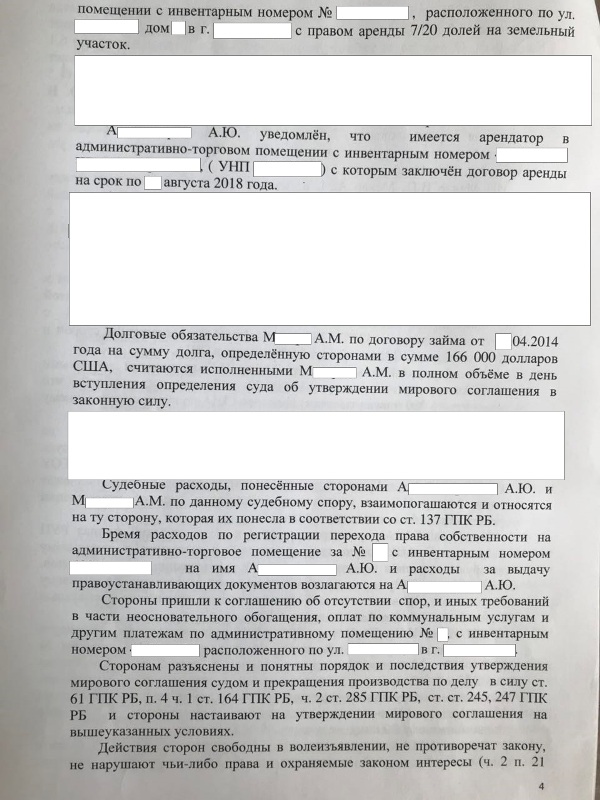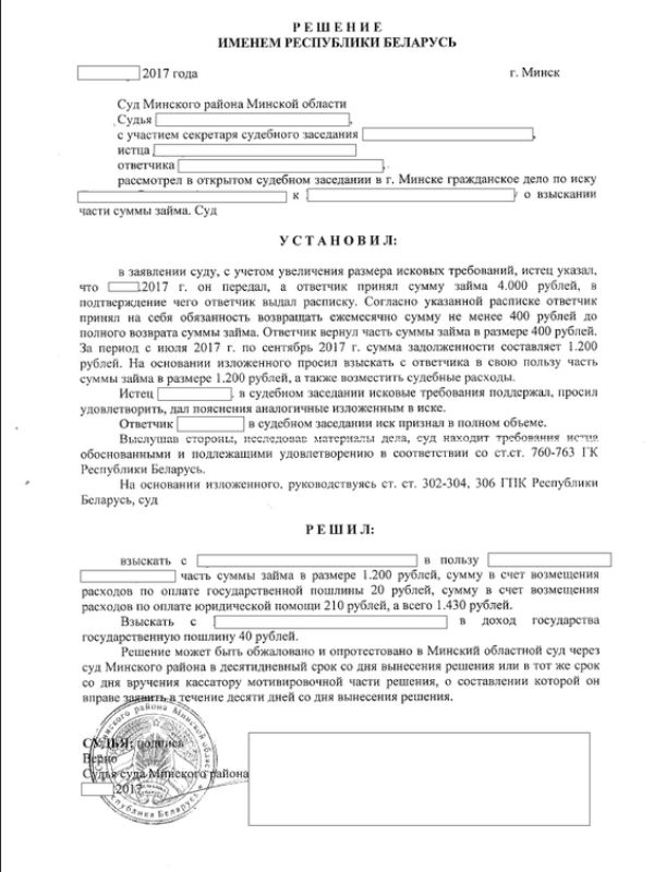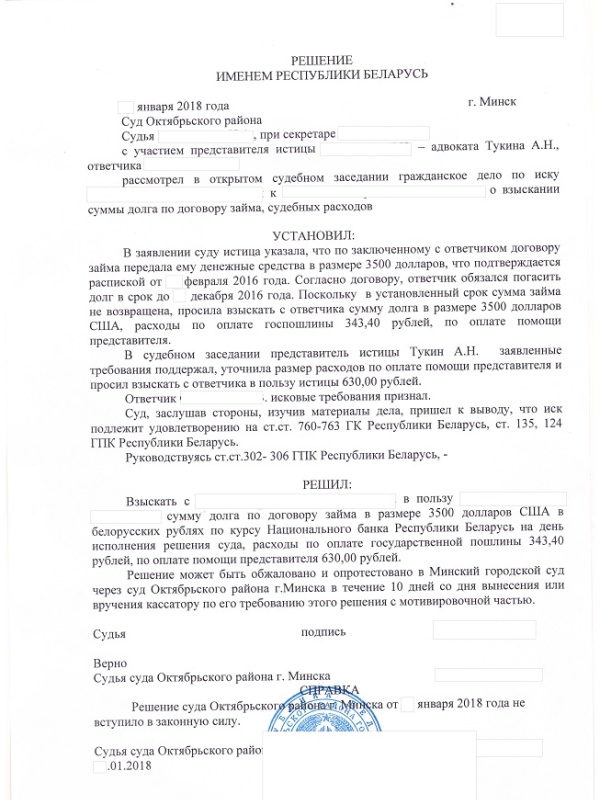 Решением суда Октябрьского района г. Минска с Ответчика в пользу Истца взыскана сумма займа в размере 3 500 долларов США, а также расходы по оплате государственной пошлины в размере 343 рубля 40 копеек и расходы по оплате юридической помощи в размере 630 белорусских рублей.