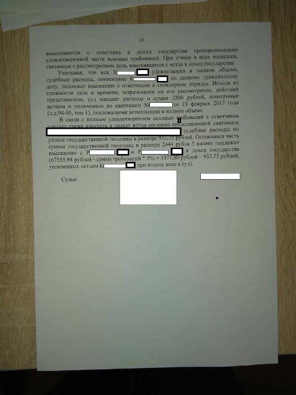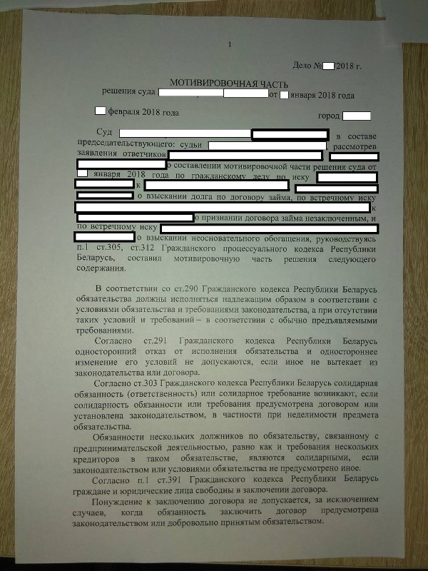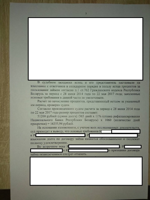 Решением суда с Ответчиков в пользу Истца взыскана сумма займа в размере 51 200 белорусских рублей, проценты за пользование чужими денежными средствами 16 355 белорусских рублей, расходы по оплате юридической помощи в размере 2 800 белорусских рублей, расходы по оплате государственной пошлины в размере 933 рубля 75 копеек.![]()