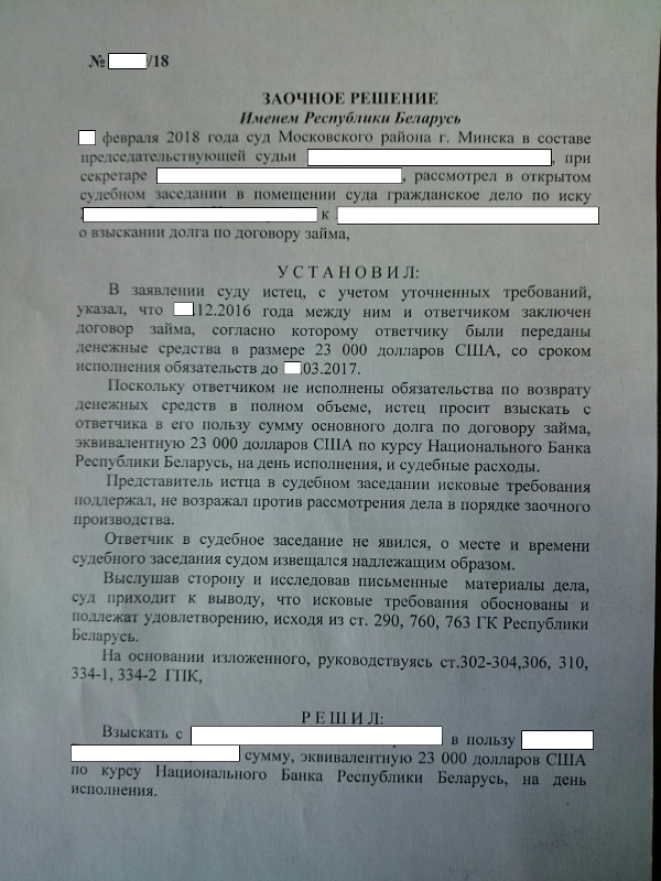Заочным решением суда Московского района г. Минска с Ответчика в пользу Истца взыскана сумма займа в размере 23 000 долларов США, а также расходы по оплате государственной пошлины в размере 2 295 рублей 29 копеек и расходы по оплате юридической помощи в размере 630 белорусских рублей.