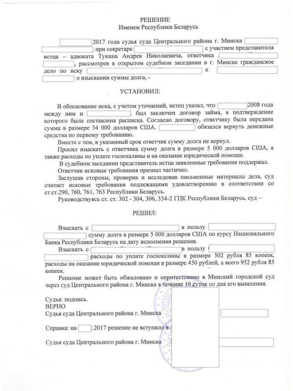 Решением суда Октябрьского района г. Минска с Ответчика в пользу Истца взыскана сумма займа в размере 3 500 долларов США, а также расходы по оплате государственной пошлины в размере 343 рубля 40 копеек и расходы по оплате юридической помощи в размере 630 белорусских рублей.
