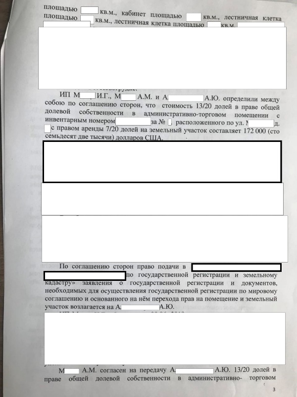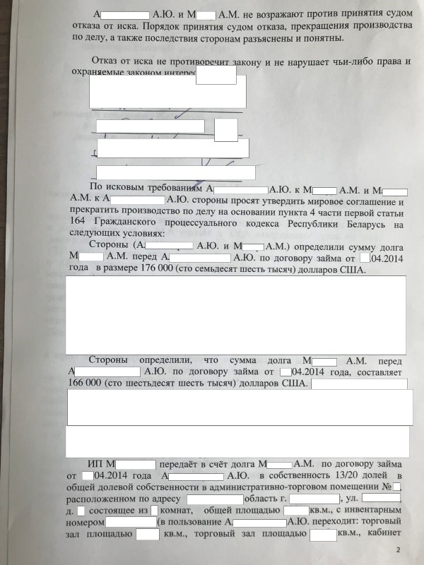 В судебном заседании стороны пришли к мировому соглашению на следующих условиях: в счет возврата долга по договору займа Истцу передается в собственность доля в административно-торговом помещении. Указанное мировое соглашение было утверждено судом.